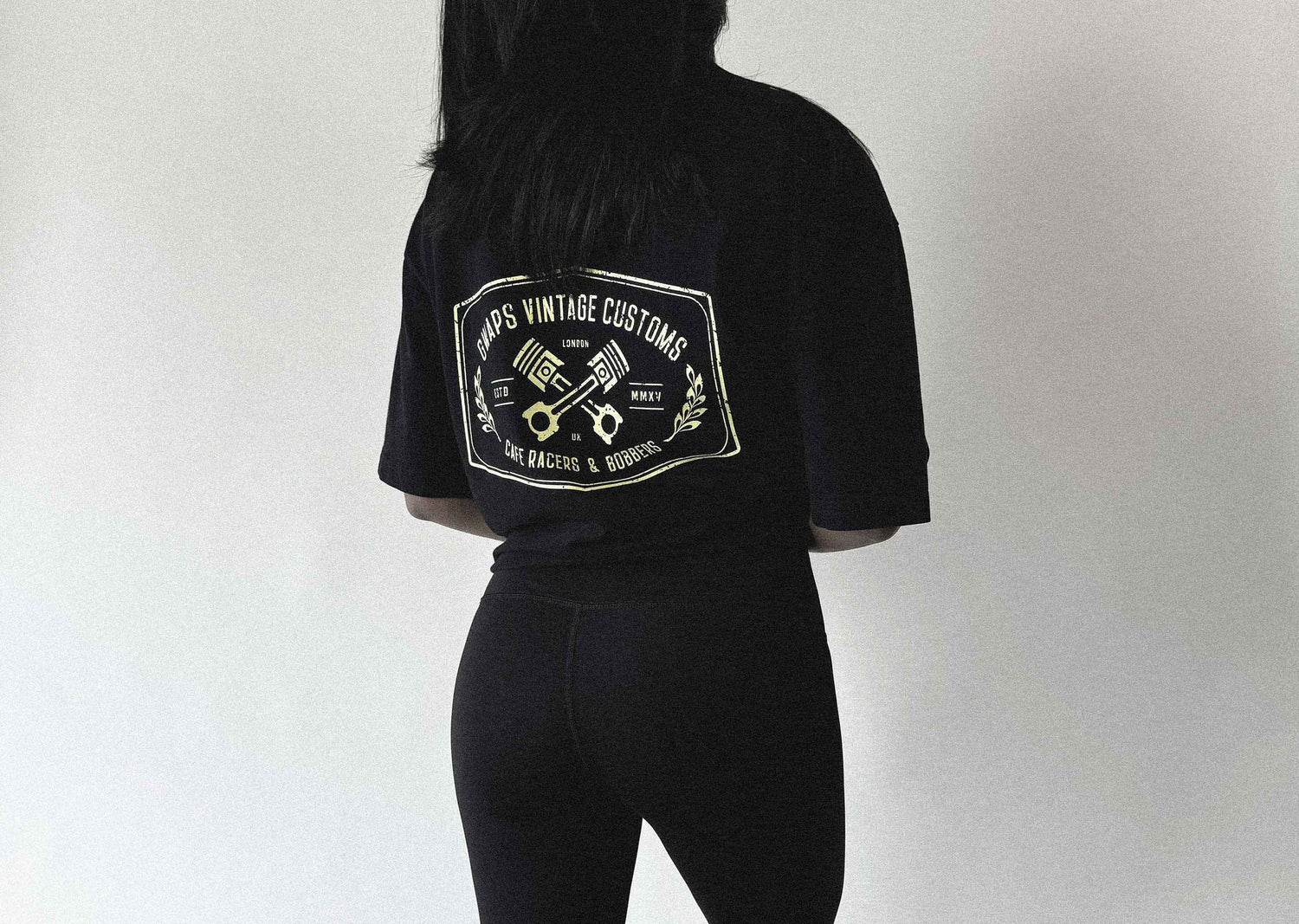 GVC London is inspired by Cafe Racer and Bobber style motorcycles. This has a men's OVERSIZED fit, but true to size. It features a faded vintage look, wide body, with dropped shoulder. It is 100% organic cotton, has a wide neck rib, and side seams. GVC London artwork on the front and back. It comes in vintage black. This is limited edition and a unisex style.